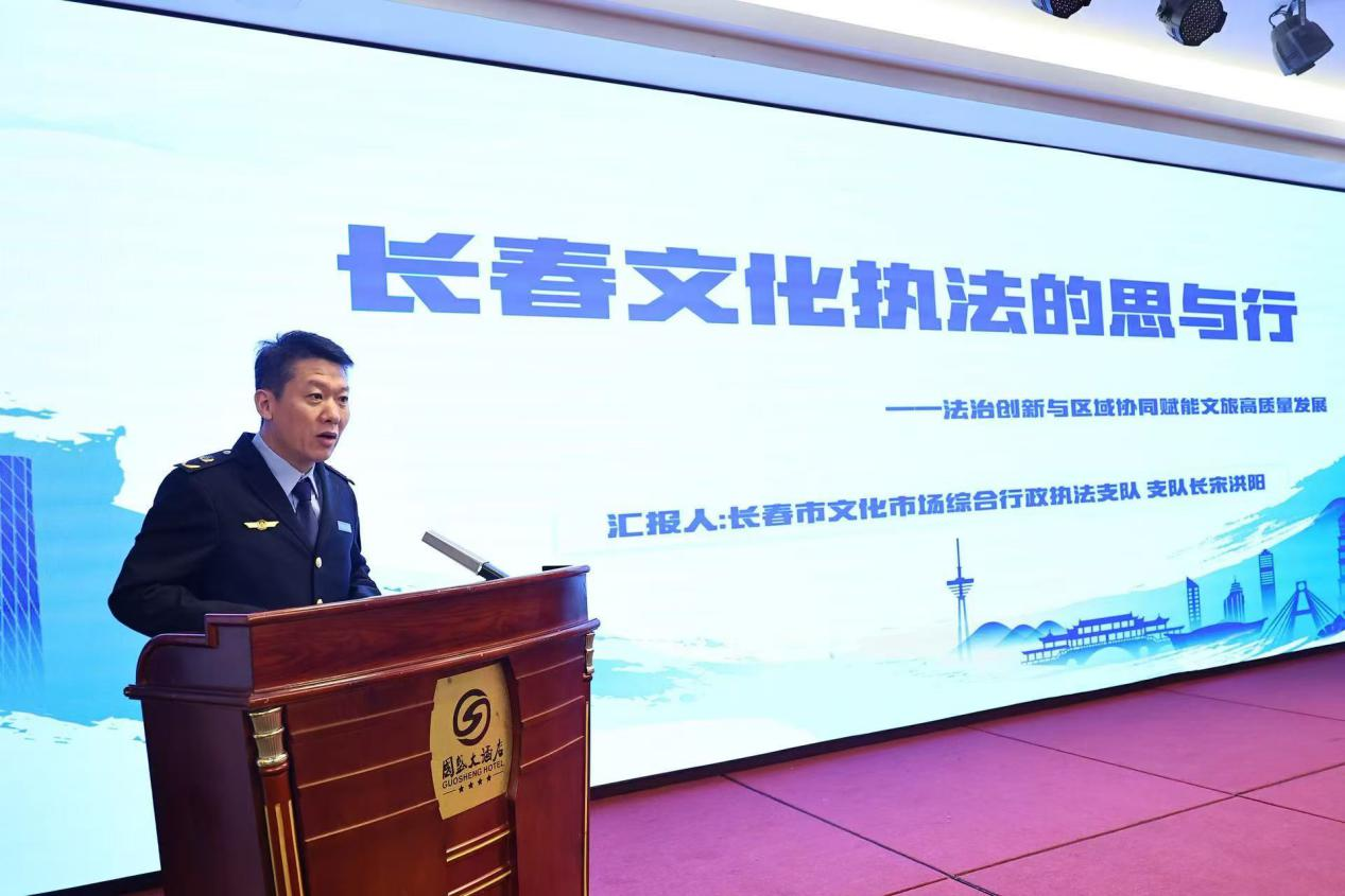 长春市文化市场综合行政执法支队支队长宋洪阳以“长春文化执法的思与行”为题,从产业演进与法治变迁维度梳理发展脉络,明确法治划定“安全边界”、提供“系统方案”、筑牢“权益屏障”的核心价值,分享“法治创新+区域协同”实践,通过三级普法、科技赋能、跨区域协作及多元纠纷化解等举措,以法治创新为文旅提质增效。